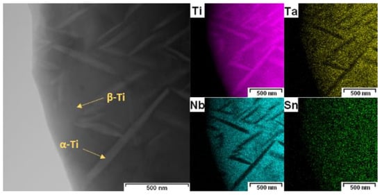 During annealing, the Sn-rich phase dissolved, and the β-Ti phase (BCC) partially transformed into the more stable α-Ti phase (HCP, a = b = 0.296 nm, c = 0.476 nm), as shown in Figure 5 and Figure 7. SPS_HT sample contained approximately 78% of β-Ti phase and 22% of α-Ti phase. The precipitated α-Ti phase is clearly visible in the TEM image (Figure 8). Electron diffraction analysis proved that the needle-like phase was α-Ti, with a hexagonal close-packed crystal lattice. Furthermore, the α-Ti phase contained less niobium than the β-Ti phase (9.0 ± 0.7 wt.%, 25.9 ± 0.7 wt.%, respectively), which was confirmed by EDS point analysis and elemental mapping images (Figure 9). Niobium, as well as tantalum, is a β-stabilizer, and thus it dissolved more in β-Ti than in α-Ti.