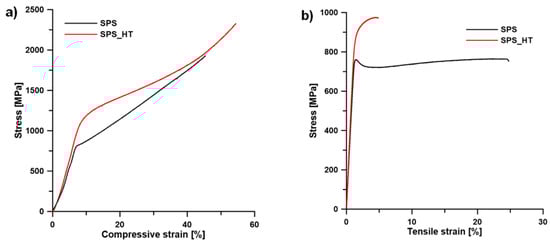A similar trend was observed after compression and tensile tests (Figure 10 and Table 2). The yield strength increased after annealing by more than 100 MPa, both in compression and in tension. Both samples (SPS and SPS_HT) behaved very plastically, and no fracture was observed during the compression tests (Figure 10a). For this reason, only the compressive yield strength (CYS) could be determined. In tension, the SPS material was plastic with ductility (A) of more than 20%. After heat treatment (SPS_HT) the material became more brittle (Figure 10b), and the ductility was only 3 ± 1%. The reason is in the precipitation of very fine α-phase particles (Figure 8 and Figure 9). The modulus of elasticity (E) of the SPS sample was 63 ± 1 GPa. After annealing, the modulus of elasticity increased to a value of 73 ± 1 GPa because of α-Ti phase precipitation.