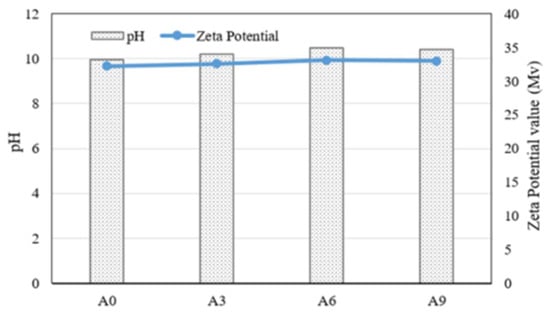 Figure 1 shows the changes in the pH and zeta potential of medium with the different amounts of the AE agent, respectively. Initial pH of pure medium was 7.0, and A0 (i.e., AE agent was not incorporated) showed a slight alkaline, a pH 9.6. These results indicate that the pH value of medium in which S. pasteurii was inoculated was similar to that of the previous study, which showed an alkaline pH of about 9.5 after 1 day of inoculation in the TSB–urea media []. This may have been due to the increase in the concentration of OH− and NH4+ formed by the decomposition of urea, which resulted in an increase in the pH, despite an increase in the amount of CO2 formed by the microbial respiration of S. pasteurii []. On the other hand, when 0.3, 0.6, and 0.9% of AE agent were added, the pH value of culture medium was 9.78, 9.93, and 9.90, respectively. It can be inferred that incorporating the AE agent did not negatively affect the ureolysis metabolism of S. pasteurii.