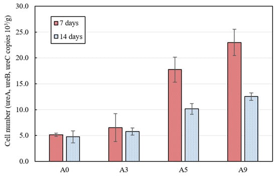 The bacterial growth rate can be rapidly decreased during the initial cement hydration and hardening period (from 7th day to 14th day of curing), due to the extreme environment (i.e., high temperature and pressure, hydrate products, etc.) formed by cement hydration []. In order to investigate the effect of the AE agent on the bacterial viability during the initial hydration process, the number of viable bacteria in the cementitious materials was measured after the 7th and 14th day of curing. The number of viable S. pasteurii cells present in the paste specimens was quantitatively analyzed using q-PCR. q-PCR analysis in this study monitored the amplification of the urea A, B, and C gene regions in real time, by means of newly designed primers used to target only the urease expression gene of S. pasteurii. Figure 2 presents the q-PCR results. The results show that the cell number (ureA, ureB, and urea C copies/g, urea, ureB, and ureC (three subunits of urease)) in the paste specimens was found to increase with increasing amount of the AE agent. This shows that as the incorporated AE agent content was increased, the number of bacterial cells capable of producing CaCO3 increased. It can be assumed that the incorporation of the AE agent generated pores that provided the space for the bacteria to survive in the cement matrix, and thus destruction of the cell membrane of the bacteria was inhibited by the hydrate in the cement matrix []. Although the amount of viable S. pasteurii increased as the amount of incorporated AE agent increased, it was found that the cell number of viable S. pasteurii decreased on the 14th day compared with that on the 7th day. This is similar to previous results that the viability and CaCO3 precipitation ability of bacteria decreased due to a decreased amount of internal voids due to the paste-hardening and densifying processes [].