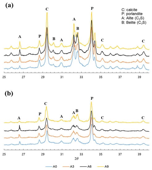 XRD patterns of the paste specimens on the (a) 7th and (b) 14th days.