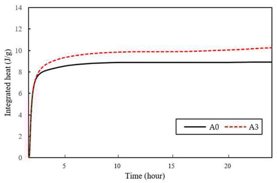 Figure 3 shows the XRD results of the paste specimens on the 7th and 14th days. The effect of the amounts of AE agent on the change in hydrate types was determined by analyzing the XRD results of the specimens A0, A3, A6, and A9 after the 7th and 14th days of curing. There was not significant difference on the hydrate types according to the amount of AE agent. It can be suggested that the amount of AE agent and the incorporation of bacterial culture solution do not significantly affect the change in the type of hydrates. The XRD results show that the CaCO3 formed by biomineralization of S. pasteurii was calcite. The calcite peaks observed for all specimens show that incorporating the AE agent in the paste specimens did not decrease the amount of calcite formation. Figure 4 shows the integral heat outputs of A0 and A3. The results of the integral heat output were significantly different from the case of not incorporating the AE agent and the case of incorporating 0.3% AE agent. The integral heat of A0 and A3 was 7.91 Joule/g and 12.27 Joule/g, respectively. It can be said that the incorporation of 0.3% AE agent can accelerate the cement hydration. In fact, the bacteria and nutrients contained in the medium are essential for the bacterial CaCO3 precipitation metabolism, but it is known that these components can enclose the cement particles and interrupt the contact between cement clinker and water, thereby retarding the initial cement hydration [,]. However, the AE agent has a structure with both anion and hydrophobicity, and it attaches to cement particles and relatively stabilizes the air bubbles []. Therefore, the incorporation of the AE agent can be expected to accelerate initial hydration by enclosing the cement clinker particles and delaying the contact between cement clinker and nutrients.