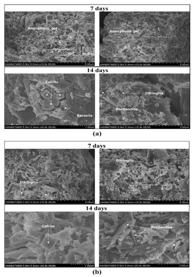Furthermore, the results of this integral heat showed a high correlation with the expression of compressive strengths in the specimens. As a result, the incorporation of the AE agent accelerated the hydration of mortar containing S. pasteurii, resulting in a higher integral heat output, which consequently increased the compressive strengths. Figure 5 shows SEM images of A0 and A3 specimens on the 7th and 14th day. Both A0 and A3 showed the formation of ettringite, hexagonal calcite, and portlandite-like plates. As shown by the XRD results, only calcite formed by microbial-induced calcite precipitation was found in the CaCO3 crystal phase, and vaterite and aragonite were not found. In addition, bacterial cells with a size of 1–10 µm were observed around the minerals. In general, the negatively charged bacterial cell surface can adsorb the metal ion and serve as a nucleation site for mineral precipitation []. Through the presence of bacterial cells observed in SEM images, it can be inferred that the addition of an AE agent has a positive effect on the improvement of the bacterial viability and metabolic performance even in the extreme environment of cementitious materials.