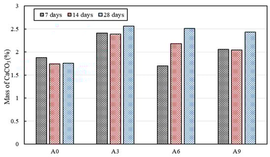Mass of CaCO3 in the paste specimens on 7th, 14th, and 28th days, quantified from TG results.