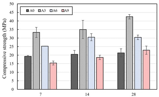 The compressive strengths of the mortar specimens are shown in Figure 8. The amount of incorporated AE agent significantly influenced the compressive strength on the 7th, 14th, and 28th days. Although specimen A3, incorporating 0.3% AE agent, showed the highest compressive strength, the compressive strength decreased when 0.6 and 0.9% AE agent was incorporated. It should be noted that the compressive strength of mortar specimens with 0.9% AE agent decreased compared to the specimen without the AE agent. The highest compressive strength was obtained when 0.3% AE agent was incorporated at 7, 14, and 28 days, and the compressive strength tended to decrease when the mixing amount of the AE agent of 0.6 and 0.9% was increased. The increase in compressive strength was observed in the mortar specimens on the 14th and 28th days. It can be inferred that the main cause of the increase in compressive strength was the effect of the AE agent on the cementitious materials and the effect of induced calcium carbonate precipitation (MICP) on the pore structures.