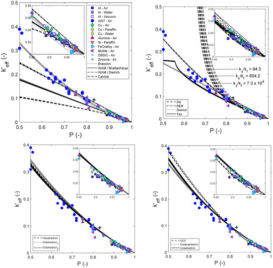 In particular, for estimating the of open-cell foams, several relations can be found in the literature. These relations are mostly based on empirical data-fitting functions (e.g., Calmidi relation) [8], geometrical models (e.g., Bracconi, Dai and Yao relations) [9,10,11], probability distributions of parallel and series models (e.g., weighted arithmetic mean relation) [12,13,14], and those based on EMA assumptions, such as the Maxwell-type and self-consistent models (e.g., Differential Effective Medium relation) [12,15].