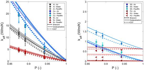 estimated from Bracconi, dodecahedron and OCF relations compared with those from numerical simulations of Al, Cu and Ni foams (left) and SS and PU foams (right). The errors bars correspond to the standard deviation as reported by August et al. [19]. Lines from Bracconi’s relation are overlapping, as it does not consider the filling medium.