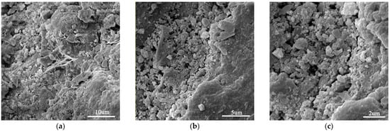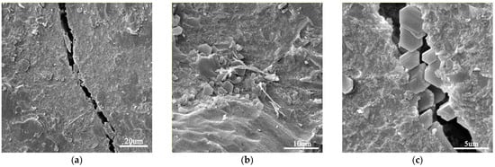 Figure 2 shows SEM images of the plain cement mortar sample. As can be seen, the microstructure was loose and porous. Figure 3 shows images of a GO-incorporated cement mortar sample after a fracture. As can be seen, GO-incorporated cement mortar showed a much denser microstructure. In addition, it can be seen in Figure 3c that a “trans-particle fracture” [] appears with the crack passing directly through CH crystals, which indicates that C–S–H gels are stronger in GO-incorporated cement mortar.