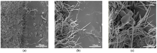 Figure 4 shows SEM images of an ITZ in GO incorporated cement mortar. As shown in the figure, the ITZ is quite compact, and precipitated CH crystal was hardly found. There were fibrillar C–S–H and an ettringite network adhering to the surface of a sand grain. This demonstrated that GO addition could improve the microstructure of ITZ, which was also reported by the literature []. Denser ITZ is good for improving chloride migration resistance.