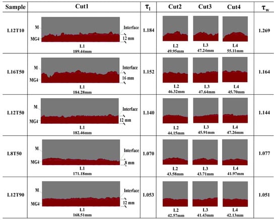 When the delay time was 10 min (e.g., L12T10), rough interface boundaries were observed owing to the high fluidity and thixotropy of both the top and bottom mortar layers. When the delay time was 90 min (e.g., L12T90), visually smooth interface boundaries were observed owing to the reduced thixotropy of the bottom layer. When the delay time was 50 min (e.g., L12T50), the roughness of the interface boundary was between those of L12T10 and L12T90. The tortuosity was used in order to characterize the roughness of the interface in both length and width directions, denoted as τl and τw, respectively. The tortuosity can be calculated by dividing contour length with the sample dimensions (length or width). As presented in Figure 6, L12T10 and L12T90 had contour lengths of 189.44 and 168.51 mm, respectively. Then the tortuosities can be calculated as 1.184 (189.44/160) and 1.093 (168.51/160), respectively. It can be inferred that the delay time played a role in determining the roughness of the interface boundary. When the delay time was 50 min, the interface boundary became rougher with an increase in the gravity of the top layer, as shown in Figure 6 (e.g., L8T50, L12T50, and L16T50). The tortuosities increased with increasing MG4 layer thickness for samples L8T50, L12T50, and L16T50 (Figure 6). From a mechanical point of view, it is desirable to increase the thickness of the MG4 layer. However, a thicker MG4 layer can lead to more significant interface deviations, which may be unbeneficial for adhesion between the two layers.