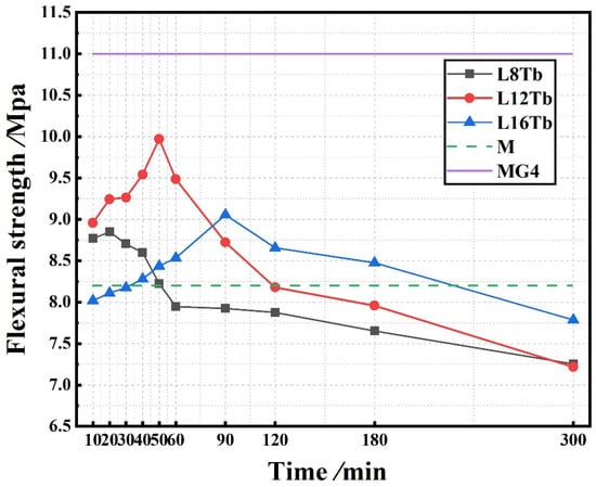 For samples with an MG4 layer thickness of 8 mm, the flexural strength was lower than those of the samples with MG4 layer thicknesses of 12 and 16 mm when the delay time was longer than 60 min. For samples with an MG4 layer thickness of 16 mm, the flexural strength was slightly higher than that of samples with 12 mm MG4 layer when the delay time exceeded 90 min. Before a delay time of 90 min, the flexural strengths of samples with an MG4 layer thickness of 12 mm were significantly higher than those of samples with a 16 mm layer.