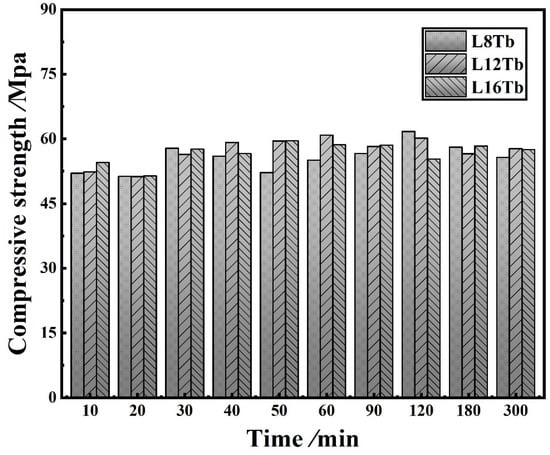 Figure 7 shows the flexural strength of the layered cement mortar beams. The flexural strength increased to a maximum and then decreased with increasing delay time, regardless of the thickness of the MG4 layer. The flexural strength was the highest for the sample, with an MG4 layer thickness of 12 mm and a delay time of 50 min. For the three types of samples with different MG4 layer thicknesses, the maximum flexural strength was found to be dependent on the delay time. For samples with an MG4 layer thickness of 8 mm, 12 mm, and 16 mm, the optimal delay time was found to be 20 min, 50 min, and 90 min, respectively. When the delay time was longer or shorter than the optimal delay time, the flexural strength was negatively affected. It should be noted that when the second layer (MG4) thickness increased, the optimal delay time also increased. According to the literature [], the optimal delay time (Tc) can be estimated by using Equation (1), and it can be simplified to Equation (2):