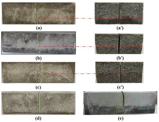 Crack development of samples: (a) L8T50, (b) L12T50, (c) L16T50, (d) M, and (e) L12T300. Fractured surfaces of samples: (a’) L8T50, (b’) L12T50, (c’) L16T50.