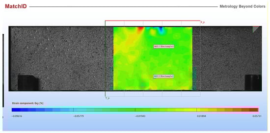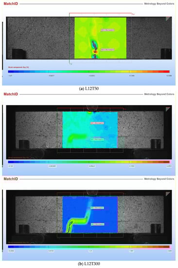 A digital image correlation (DIC) system provided by MatchID (Belgium) was used to measure the deformation field of layered cement mortar samples. The deformation field of a square area located in the middle of the sample was calculated, and then the in-plane shear strain was determined. Figure 10 shows the in-plane shear strain distribution just before failure for samples L12T50 and L12T300. For sample L12T50, there was no sign showing delamination could happen according to shear strain distribution. However, for sample L12T300, it is clear that the shear strain was larger at the interface. Future studies will be conducted to investigate the debonding mechanism of layered cement mortar samples.