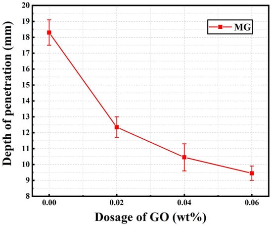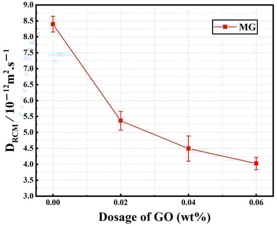 Figure 12 shows the chloride migration coefficients of the normal samples (MG2, MG4, and MG6) listed in Table 3. As shown in Figure 12, the DRCM values decreased notably with an increase in GO content. When GO content was 0.04%, the DRCM value was decreased by 46.5%, compared to plain sample M. This trend indicated that the chloride corrosion resistance of cement mortar could be improved by GO incorporation, which hindered the migration of chloride ions. This inference is in agreement with previous studies [,], which concluded that the addition of GO could improve chloride diffusion resistance.
