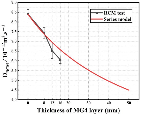 As shown in Figure 14, in the RCM test, the layered sample can be considered as two layers of materials are aligned in series, with chloride ions diffusing uniaxially from the MG4 layer to the M layer. Therefore, the bulk chloride migration coefficient of the layered sample can be calculated as