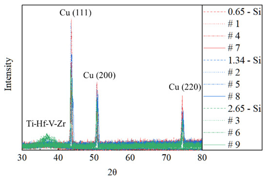 XRD of Ti-Hf-V-Zr films deposited on silicon and foamed porous copper substrates: 0.65 µm, 1.34 µm, and 2.65 µm thick NEG-coated Si substrates; samples #1, #2, #3, #4, #5, #6, #7, #8, and #9.