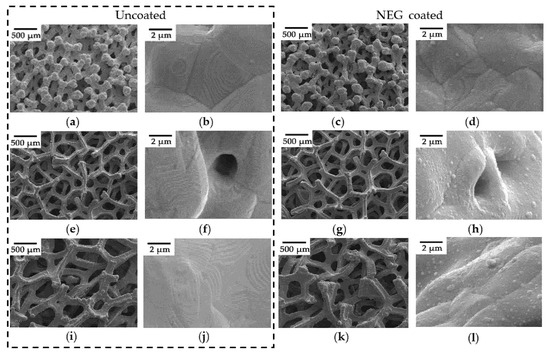 The SEM micrographs of the uncoated/NEG coated porous copper with average pore sizes of 100, 300, and 500 µm, respectively. (a,b) Uncoated, 100 µm; (c,d) 0.65-µm-thick NEG coated, 100 µm. (e,f) Uncoated, 300 µm; (g,h) 0.65-µm-thick NEG coated, 300 µm. (i,j) Uncoated, 500 µm; (k,l) 0.65-µm-thick NEG coated, 500 µm.