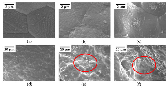 SEM micrographs of different areas on the surface of sample #9. (a−c) film surface morphologies with a scale of 2 µm and (d−f) with a scale of 20 µm.