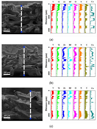 The samples were brittlely fractured at room temperature (RT) to produce the fresh cross-section surface after immersion in the 77 K liquid nitrogen for ~5 min. The cross-sectional SEM micrographs and the EDS line scannings of Samples #2, #5, and #8 are shown in Figure 5. The EDS line scanning results showed that the deposition of the coating mainly occurred at the outer surface, because the Cu element was barely found on it but the partial coating on the inner surface. Additionally, the contents of Ti, V, Hf, and Zr elements obviously decreased from the outer surface of the substrate to the inner surface. Compared with Samples #5 and #8, it is noteworthy that the line scanning of Sample #2 showed a low content of Ti, V, Hf, and Zr elements on the substrates, and only weak Ti, V, Hf, and Zr signals were observed on the inner pore substrate surface. For open-cell porous materials, the outer surface area is much smaller than the inner porous surface area [16]. It can be seen from the micrographs in Figure 5 that the film covers the inner surface of the 3D structure of the porous copper, suggesting that the 3D structure is beneficial for the increase in surface area in film growth. Besides, Figure 5 also reveals that this foam metal skeleton has a hollow throughhole structure.