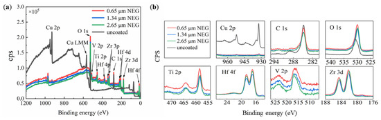 The XPS spectra of (a) uncoated (black) open-cell copper foam with pore size of 300 µm, Ti-Hf-V-Zr NEG film coated open-cell copper foam (Sample #4, red), (Sample #5, blue), and (Sample #6, Green); (b) the XPS survey scan of Cu, C, O, Ti, Hf, V, and Zr in the Ti-Zr-V-Hf film with foamed porous copper substrates.