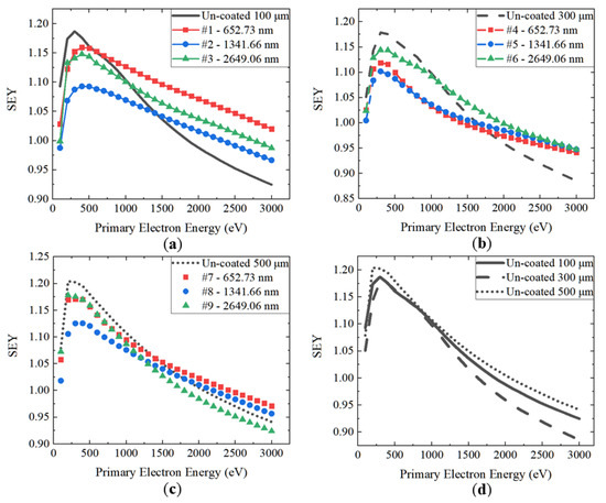 The SEY curves of foamed porous copper substrates with and without coating. (a) Uncoated foamed porous copper with 100, 300, and 500 μm pore size. (b) Samples #1, #2, and #3 and uncoated 100 μm. (c) Samples #4, #5, and #6 and uncoated 300 μm pore size. (d) Samples #7, #8, #9, and uncoated 500 μm.