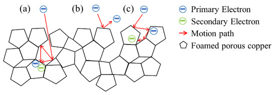 Secondary electrons are induced when primary electrons impact on the surface of the material. As shown in Figure 8, when they are induced into the uneven 3D surface of the foamed porous copper, the pores and uneven grooves trap secondary electrons (Figure 8a,c), and they only partially escape to the outside (Figure 8b), while the rest are trapped in the network-like open pore structure. Therefore, the probability that the electrons can escape from the open-cell copper foam surface is reduced, resulting in a lower SEY.