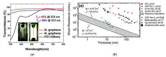 (a) Transferred graphene as TCSL integrated into GaN-based LEDs: Transmittance from 300 nm to 800 nm of 2L and 4L graphene in comparison to the typical transparent electrode ITO. Inset: optical images of light emission of a typical LED device (left) without and (right) with few-layer graphene. (b) Sheet resistance of different transparent conductors versus film thickness. (a) Reproduced with permission from [23]. Copyright 2011 American Institute of Physics. (b) Reproduced with permission from [48]. Copyright 2010 American Chemical Society.