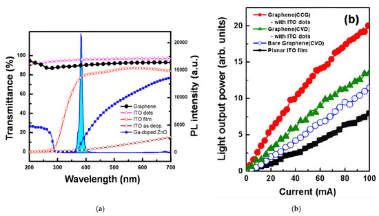 As previously mentioned, both transferred and directly grown graphene TCSL on the p-GaN LED substrate have a higher sheet resistance, and a higher contact resistance to p-GaN, than ITO. In contrast to ITO with, for example, 10% transparency at 300 nm, the transmission of graphene TCSLs remains sufficiently high (>80%) in the UV-VIS spectral range as illustrated in Figure 3a. However, the transmittance of ITO nanodots (NDs) with an average diameter of around 150 nm [63] has been proven to stay sufficiently high in a wide range of 200–700 nm (Figure 3a pink triangles). Additionally, the ITO-nanodots can provide texturing effects due to their spherical shape, which helps to reduce the total number of reflected photons, and thus increases the extraction efficiency [50,69].