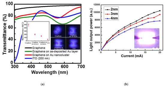 As previously mentioned, single layer graphene (SLG) has a high theoretical (~97%) and experimental (≥91%) optical transmittance () over a wide spectral range from 200 nm to 1000 nm [25,43]. Even for two-layer graphene (2LG) and four-layer graphene (4LG) the transparency is easily over 80% from the ultraviolet to the infrared region, as shown in Figure 1a. In contrast, a dramatic transparency drop of a conventional ITO TCSL is observed below a wavelength of 400 nm. Transferred graphene films supply a good current spreading in GaN-based LEDs with respect to the bare GaN-based LEDs. An enlarged luminescence area around the p-contact electrode, as illustrated in the inset of Figure 1a, can be repeatedly observed in numerous works [23,44,45,46]. From a microscopic point of view, this improved distribution of injected holes through graphene in GaN-based MQW LEDs ensures a shorter transport time of holes along the lateral direction, a reduced capture time of holes by the quantum wells, which is revealed by a time-resolved electroluminescence (TREL) measurement [47].
