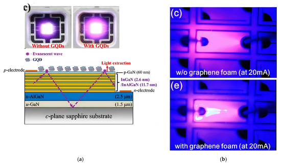 The implementation of QNDs in a GaN-based LED device structure is illustrated schematically in Figure 5a. GQDs can exhibit enhanced UV absorption compared to 2D graphene due to the plasmonic effect [45]. The lateral dimension of GQDs is less than 100 nm [80], which enables collective electron movement named as surface plasmons [81,82]. Due to this collective movement of charge carriers in GQDs, the transverse part of the totally reflected UV light at the interface between air and p- or n-type doped GaN can be absorbed by GQDs. During this process, holes or electrons may be generated in the graphene and injected back into the active layers to contribute to the recombination process. As a consequence, an enhanced EL intensity, an improved LOP, and an increase of the EQE from 6.9% (without GQDs) to 11.8% (with GQD) at 100 mA was obtained [45]. Applying nitrogen doped GQDs on the n-GaN side for vertical GaN-based LEDs, both LOP and EQE are enhanced by a factor of three compared to vertical LEDs without GQDs [60].