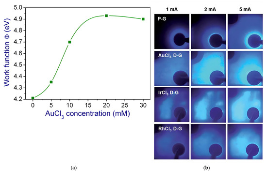 Use of various metal-chlorides, such as AuCl3 [31,73,93,94], IrCl3 and RhCl3 [38], was attempted for doping graphene. All these dopants show a clear enhancement of the graphene work function. As illustrated in Figure 7a the doping concentration has a significant impact on the graphene work function. A non-linear increase of the work function from 4.2 eV to around 4.93 eV is observed as the AuCl3 concentration increases from 0 to 20 mM (1 mM = 10−3 mol/L). However, a further increase of the AuCl3 concentration to 30 mM will slightly reduce the graphene work function [73]. Doping with Au-, Ir- and Rh-chlorides with the same concentration of 20 mM exhibit a similar increase of the graphene work function to 4.9, 4.95 and 5.1 eV, respectively [38]. The current spreading effect at different input currents is illustrated in Figure 7b. An enlarged light emitting area is conspicuous for graphene TCSL doped by all the three dopants. For a brief overview of the doping effect on graphene, properties such as , and work function () are listed in Table 5, together with their impact on the LED performance.