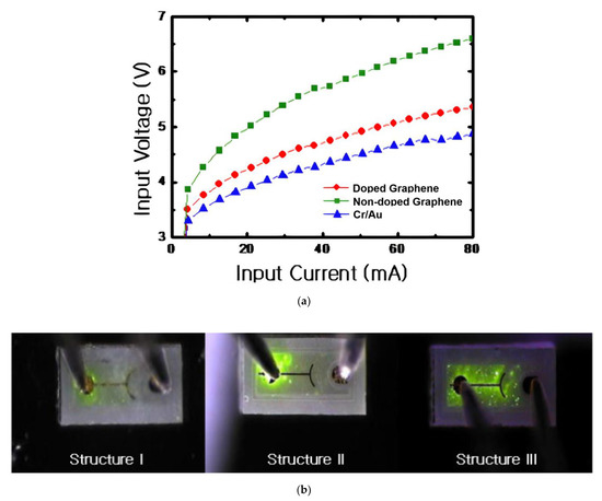One study with HNO3 acid doping of graphene shows an enhancement of the current spreading in GaN-based LEDs as well [98]. A significantly reduced forward voltage in GaN-based LEDs with graphene TCSL at a given current is obtained after doping as shown in Figure 8a. Figure 8b illustrates a clearly enhanced current spreading in LEDs especially with doped graphene TCSL (structure III). Moreover, inserting undoped MLG TCSL improves LOP by 42.3% compared to the bare LEDs, and 30.8% extra enhancement can be obtained after HNO3 doping of MLG.