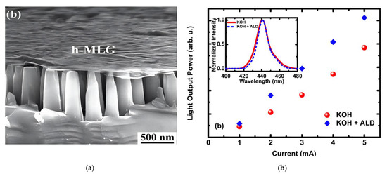 Graphene TCSLs are also applied for GaN-based devices with complex 3D architecture, such as vertical light emitting nanorods, nanopillars and photonic crystal structures with air holes. Due to its mechanical robustness and stretchability [55,67], graphene works well for current spreading and connecting different light emitting parts in such structures. Nanopillar and nanorod devices have large light emitting areas, and can release strain in the MQW and enhance light extraction due to increased scattering and reduced reflection at the sidewalls [101,102,103]. One application of multi-stacked four-layer graphene that encases nanopillars is illustrated in Figure 10a. This approach avoids polymer filling between pillars or in air-holes [104]. Passivation by the atomic layer deposition (ALD) of, e.g., Al2O3 on graphene could further increase the LOP of GaN-based nanopillar LEDs by 30% as shown in Figure 10b.