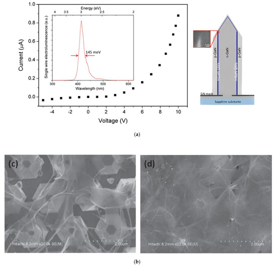 - Tchernycheva, M.; Lavenus, P.; Zhang, H.; Babichev, A.V.; Jacopin, G.; Shahmohammadi, M.; Julien, F.H.; Ciechonski, R.; Vescovi, G.; Kryliouk, O. InGaN/GaN core-shell single nanowire light emitting diodes with graphene-based p-contact. Nano Lett. 2014, 14, 2456–2465. [Google Scholar] [CrossRef] [PubMed]
