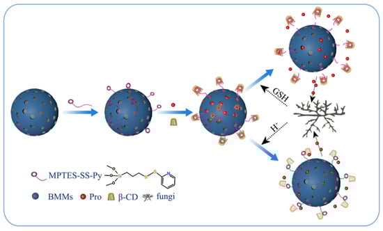 In this study, we grafted a disulfide-modified silane coupling agent onto the surface of BMMs, and Pro was loaded in NPs by physical adsorption. The pyridine ring (Py) on the surface of the silane coupling agent was recognized by β-CD to form a host–guest supramolecular valve, which was further wrapped on the BMMs carrier to form a pH and redox dual-responsive pesticide release system (Pro@BMMs-SS-Py/β-CD). The fabrication process is shown in Figure 1. The physicochemical properties, release behavior, stability, adhesion, and bioactivity of the NPs were also investigated. This study provides a novel strategy for managing fungal disease and reducing environmental pollution.