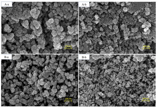 SEM images of (A-a, A-b) BMMs and (B-a, B-b) Pro@BMMs-SS-Py/β-CD nanoparticles.