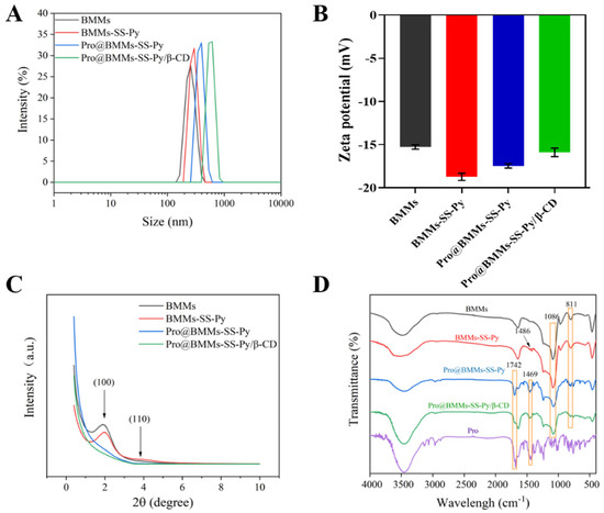 (A) Particle size distributions (B), zeta potentials, (C) XRPD patterns, and (D) FTIR spectra of Pro@BMMs-SS-Py/β-CD NPs and control samples.