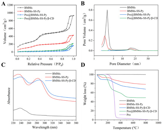(A) BET isotherms, (B) pore size distribution curves, (C) UV–vis spectra, and (D) TGA curves of Pro@BMMs-SS-Py/β-CD NPs and control samples.