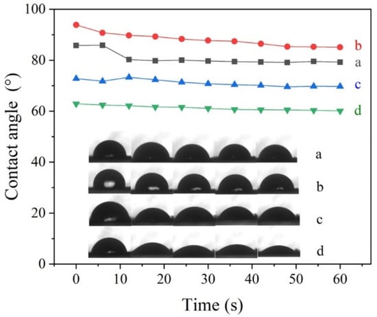 Foliage-adhesion experiments were conducted to evaluate the adhesion behavior of Pro@BMMs-SS-Py/β-CD NPs. As shown in Figure 5, the dynamic contact angle of Pro@BMMs-SS-Py/β-CD NPs decreased from 62.89 to 60.11 in 1 min, which was obviously lower than that of Pro technical solution (from 93.87 to 85.09) and deionized water (from 85.81 to 79.23). Data showed that β-CD-coated Pro@BMMs-SS-Py microcapsules exhibited excellent adhesion properties. Compared with deionized water and technical Pro, a large amount of –OH on the β-CD surface interacted with –CHO and –COOH on the blade surface, which increased the electrostatic force between NPs and the blade, and enhanced NPs wettability.