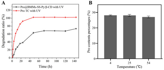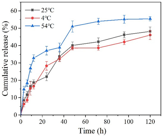 The sustained release curves of Pro at different temperatures are shown in Figure 8. The cumulative release rate of Pro gradually improved with the increase in temperature. The release ratio of Pro from Pro@BMMs-SS-Py/β-CD NPs at 54 °C was 55.4%, and those at 25 and 4 °C were 48.2% and 46.1%, respectively. This was mainly due to the high temperature accelerating the movement of Pro molecules in the NPs channel [41]. In addition, the melting point of Pro is below 50 °C, and the morphology of Pro encapsulated in the pores of the nanocarrier gradually changed from solid to liquid, which promoted the enhancement of the release rate of NPs.