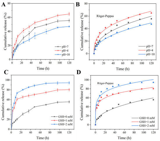 Cumulative release curves and Ritger-Peppas models of Pro@BMMs-SS-Py/β-CD NPs with different (A,B) pH and (C,D) GSH values.