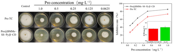 The antifungal activity of Pro@BMMs-SS-Py/β-CD NPs against R. solani was investigated using the growth-rate method. As shown in Figure 9, the inhibition rates of NPs and Pro TC were 85.5% and 73.5%, respectively, at the Pro-as-an-active-ingredient concentration of 1 mg·L−1 after 12 days. Accordingly, the IC50 values of Pro@BMMs-SS-Py/β-CD NPs (0.2003 ± 0.0018) were 11% lower than those of Pro TC (0.2249 ± 0.02) owing to the sustained release of Pro in the nanocomplex systems. R. solani secreted acidic substances during colonization [42], and acidification of the external environment caused the pH response of the NPs. As nanocarriers were modified by β-CD, the connection between β-CD and guest molecules was broken by H+, resulting in the release of Pro under acidic environments. In addition, the presence of glutathione in the internal environment of fungi caused the redox response of the NPs. The sulfhydryl group (−SH−) in glutathione broken the disulfide bond (−S−S−) integrated in Pro@BMMs-SS-Py/β-CD NPs, and promoted the release of Pro from NPs. The above redox and pH dual response of NPs resulted in the sustained release of Pro from NPs and significantly inhibited the growth of R. solani.