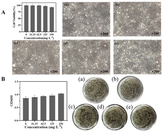 Biosafety evaluation of BMMs−SS−Py/β−CD NPs against (A) 16HBE cells and (B) E. coli. The concentrations of Nps in 16HBE cells and E. coli. (a) 0 mg·L−1, (b) 31.25 mg·L−1, (c) 62.5 mg·L−1, (d) 125 mg·L−1, and (e) 250 mg·L−1, respectively.