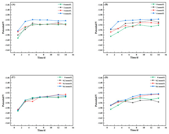 Figure 1C shows that the open-circuit potential changes of sample AZ31B in PO43− solutions at different concentrations were roughly the same as those in the control assays (3.5% NaCl). The potential changed rapidly during the 1st–5th day Then, it became stable from day 7 to day 14. Data in Figure 1D show that the open-circuit potential of the magnesium alloy sample moved rapidly and then slowly for 1–3 d after immersion in 0.4 and 0.6 mmol/L phosphate solution. The results showed that the surface of the sample was covered by magnesium hydroxide hydrolysed by the corrosion products, which resulted in a decrease in the active reaction area and a positive potential shift [27,28].