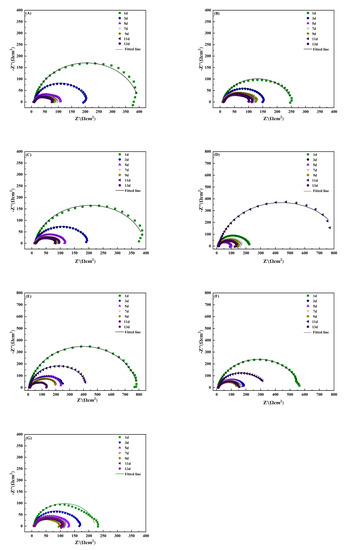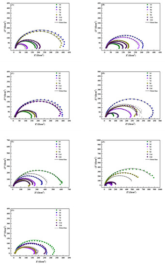 Electrochemical impedance spectra for AZ31B magnesium alloy immersed in 3.5% NaCl solution with different concentrations of simulated inorganic metabolites for different times. (A–C): soaked in 0.2, 0.4, and 0.6 mmol/L phosphate in 3.5% NaCl solution; (D–F): soaked in 3.5% NaCl solution with 2, 4, and 6 mmol/L sulphur ion concentration; (G): 3.5% NaCl solution.