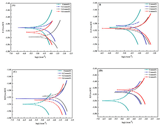 Potentiodynamic polarisation curves of magnesium alloys soaked in 3.5% NaCl solution with different concentrations of inorganic metabolites for 14 d. (A,B): magnesium alloy AZ31B in phosphate and sulphur ion solution; (C,D): AZ63B magnesium alloy in solution with phosphate and sulphur ions.