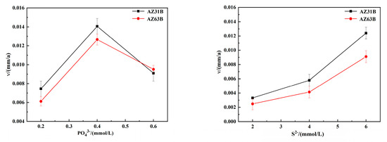 Synthetic seawater containing 3.5% NaCl was used as a blank control. According to the usual metabolism of SRB [25], Na2S·9H2O was used to study the effects of different concentrations of sulphur ion metabolism on magnesium alloys by preparing concentrations of 2, 4, and 6 mmol/L, respectively. Since phosphorous compounds are unstable, volatile, and highly toxic, they are not suitable for electrochemical tests. An appropriate concentration of PO43− was selected for electrochemical tests [26]. pH was between 6.0 and 6.5.