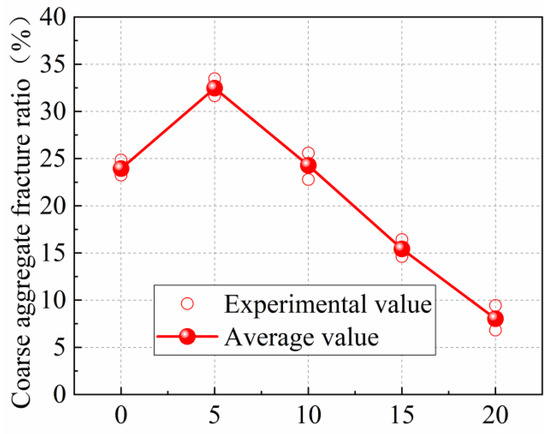 The fracture morphology of the specimens with different steel-slag-powder replacement ratios is shown in Figure 3. Three kinds of fracture morphology of coarse-aggregate fracture, cement-matrix fracture, and coarse-aggregate surface were captured, as can be seen from Figure 3. Different fracture-morphology distributions are observed in fractures of the specimens with different steel-slag-powder replacement ratios. In order to analyze the fracture morphology of specimens under different steel-slag-powder replacement ratio, an image-recognition method is utilized to divide the fracture morphology based on the different color-gamut ranges of coarse-aggregate fracture, coarse-aggregate surface, and cement-matrix fracture by setting the color-interval range from 30 to 230, as shown in Figure 3, where black is the coarse-aggregate fracture, blue is the coarse-aggregate surface, and the white part is the cement matrix. Based on this, in order to analyze the fracture performance of the specimen, the ratios of fracture area of coarse aggregate to the total fracture area of the specimen (referred to as coarse-aggregate fracture ratio R) under different steel-slag-powder replacement ratios are analyzed, as shown in Figure 4. As can be seen from Figure 4, within the range of steel-slag-powder replacement ratios set in this paper, coarse-aggregate fracture ratio R first increases and then decreases with the increase in steel-slag-powder replacement ratios, in which the R of SPC5 concrete reaches a peak percentage of 32.46%, which is 35.53% higher than the NC percentage of 23.95%. The concrete of specimens SPC10, SPC15, and SPC20 have 24.29%, 15.43%, and 8.03% of R, which are 1.42% higher and 35.57% and 66.47% lower than NC, respectively. Obviously, the larger the R is, the greater the fracture-energy dissipation of the specimens. This is mainly because the steel-slag powder contains hydration-activity substances such as calcium oxide and aluminium trioxide, which strengthen the bonding interface between the aggregate and cement paste to a certain extent. At a lower replacement ratio of SPC, the effect of steel-slag powder and steel-slag powder particles fill the concrete interior to improve the concrete-fracture strength [15], so the crack extension proceeds based on the lower fracture strength of the coarse aggregate. With the increase in steel-slag-powder replacement ratio, the fractures of the specimens are rougher and the area of the coarse-aggregate-cement matrix-debonding interface increases, while the coarse-aggregate fracture ratio R decreases. The reason may be that higher levels of steel-slag-powder replacement ratio lead to lower amounts of cement, which affects the overall cement material effect. In addition, too large a dose of steel-slag powder cannot improve the interfacial properties between the cement and the aggregate, producing more internal voids, so the strength will be reduced.