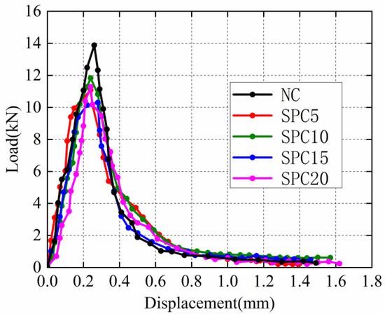 It can be seen that the fracture toughness of the specimens increases and then decreases with the increase in the steel-slag powder-replacement ratio within the test range of this paper in Figure 8, which is consistent with the damage-mode pattern of the specimens. The fracture toughness of SPC5 increases by 53.22% as compared to NC, while the values for SPC10, SPC15 and SPC20 decrease by 0.31%, 17.65%, and 46.14%, respectively. It can be concluded that the appropriate amount of steel-slag powder can improve the fracture toughness of concrete. The reason can be illustrated as follows: On the one hand, the steel slag has cement properties to produce more calcium silicate hydrates in the concrete matrix with cement, which increases the bond strength of cement paste and aggregate. On the other hand, with smaller-sized particles, the addition of steel-slag powder optimizes the fine-aggregate gradation, and enhances the compactness of concrete and increases its mechanical strengths to different degrees. When the strength of the coarse aggregate is lower than the bond strength of concrete, cracks will propagate along the coarse aggregate, resulting in the concrete-crack propagation requiring more energy consumption. However, as the replacement ratio of steel-slag powder increases, the mechanical strengths begin to decrease, which leads to a continued decrease in the ability of concrete to resist the stable propagation of cracks. The main reason is that steel-slag powder cannot replace cement as the main cement material. Reducing the amount of cement makes the concrete bond strength decrease gradually. At this time, the failure form of concrete is changed from the shear failure of coarse aggregate to the failure of the concrete-bonding layer, causing the fracture energy to decrease. This indicates that an appropriate content of steel-slag powder improves the fracture performance of SPC.